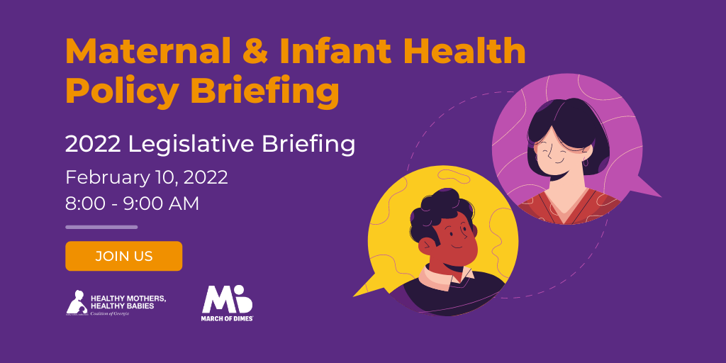 We invite you to join our 2022 Virtual Maternal and Infant Health Policy Briefing, cohosted by March of Dimes, on February 10, 2022. During these unprecedented times, understanding the state of maternal and infant health in our State so that we can improve the health and well-being of our moms and babies is more important than ever. Attendees will explore maternal and infant health data to deepen their understanding and learn about policy priorities that, if adopted, would be pivotal in increasing health outcomes for moms and babies in our State. We will also hear from State policymakers about what they plan to tackle in the year ahead and how these issues may impact Georgia’s families. We hope you’ll join our community of advocates and changemakers!